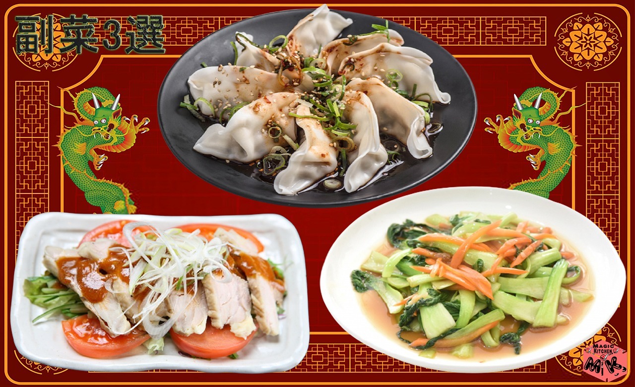ここでは副菜を野菜炒めにしていますが、和え物などのあっさりの組み合わせでもいいし、もう少しがっつり行きたい場合は八宝菜などと組み合わせるのも一つの方法です。