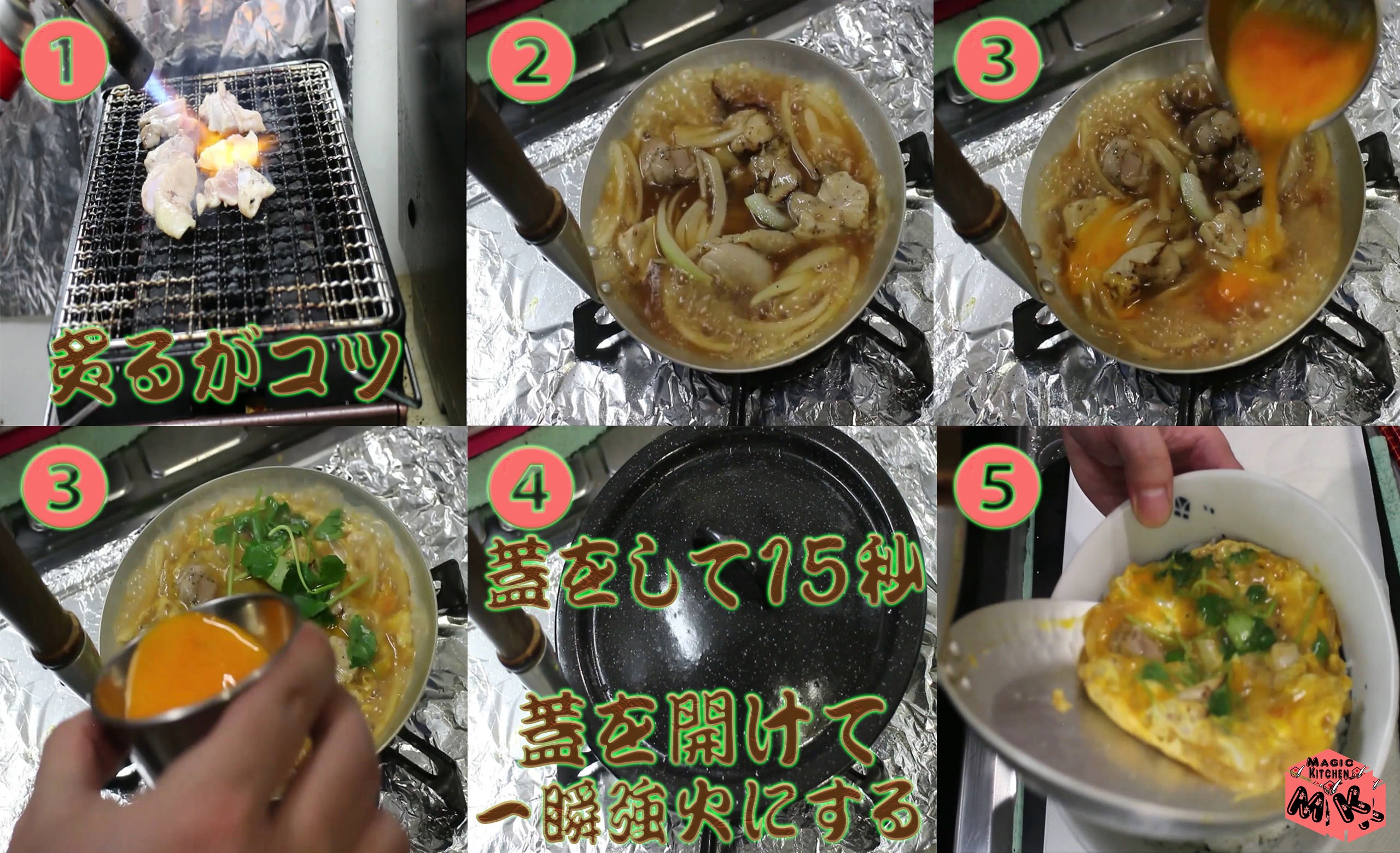 ②卵をとじる時に、2回に分けて入れる。また卵を入れて外側から火が入っていきますので、1/3弱火に程火が入ったら、蓋をして弱火にして、15秒したら、蓋を取り、1分から2分放置する事で、なべ底からはがれやすくなる。