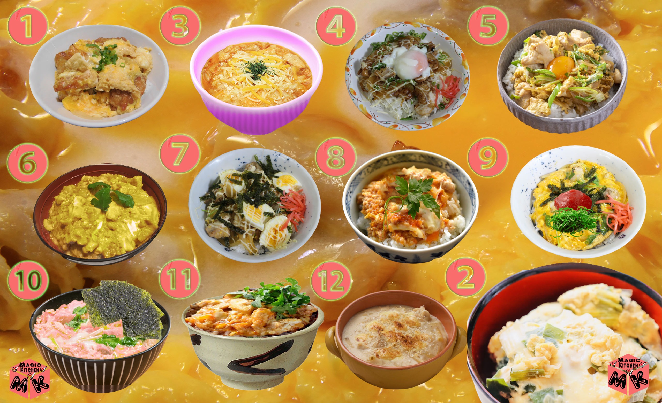 - ⑩鶏肉×玉葱×パプリカ×温泉玉子×コチュジャン=韓国風親子丼